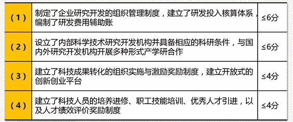 企业创新能力主要从知识产权、科技成果转化能力、研究开发组织管理水平、企业成长性等四项指标进行评价。各级指标均按整数打分,满分为100分,综合得分达到70分以上(不含70分)为符合认定要求。四项指标分值结构如下: